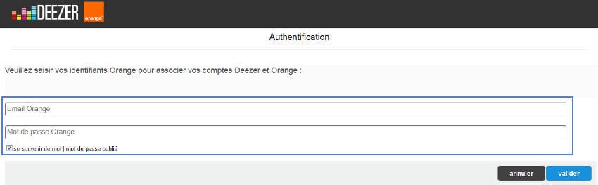 - Saisissez votre mail Orange ainsi que votre mot de passe. Il s’agit de vos identifiants de messagerie Orange, ils sont indépendants de vos identifiants Deezer