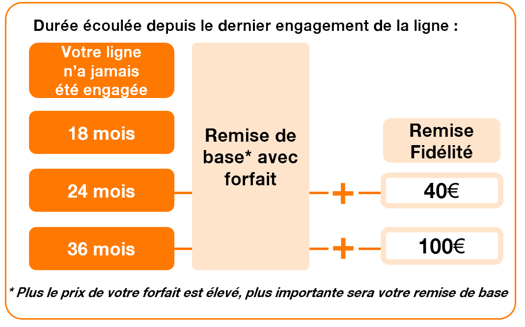 Qui a dit que les relations sont toujours plus belles au début ? Certainement pas nous ! Chez Orange, plus vous restez, plus vous gagnez. En tant que client Orange, vous bénéficiez d’une remise de base sur votre mobile tous les 18 mois. Et en plus, on vous offre des remises de fidélité supplémentaires si vous restez avec nous un petit peu longtemps.