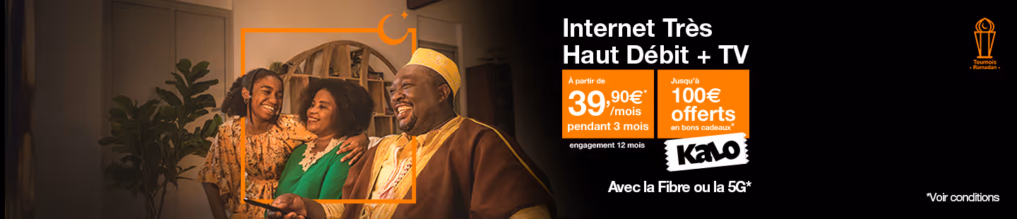 *Valable à Mayotte à partir du 05/02/2026 dans la limite de 150 clients. Pour toute nouvelle souscription à une offre 5GHome + TV ou fibre + TV à partir de l’offre Livebox Fibre, de 20€ à 100€ en chèques cadeaux Kalo valables pour l’achat d’une TV dans les magasins Kalo.